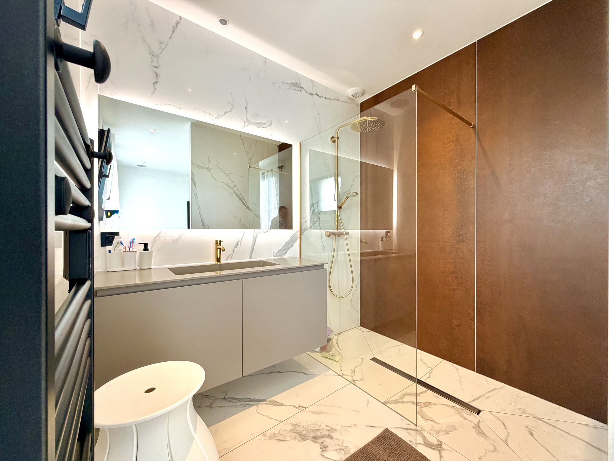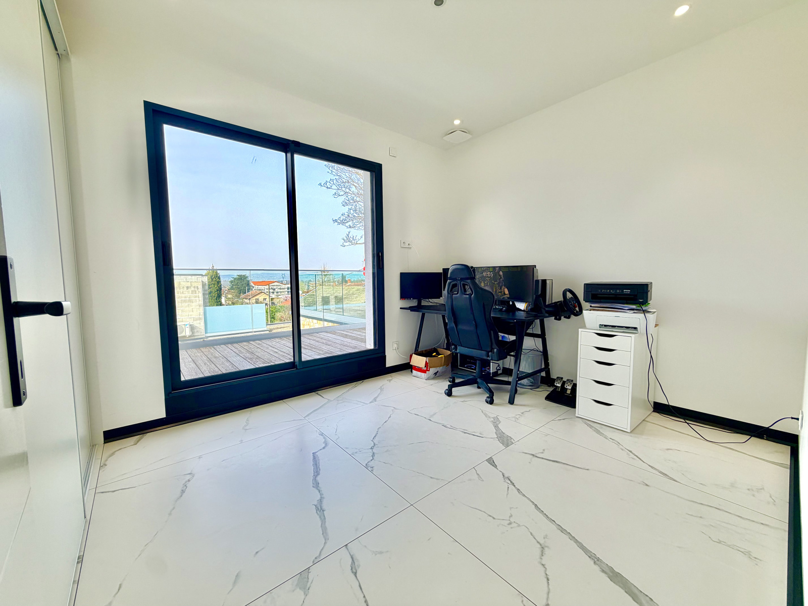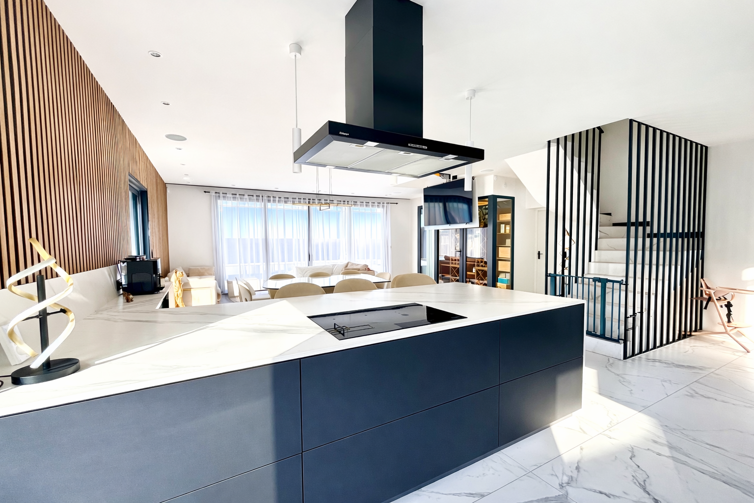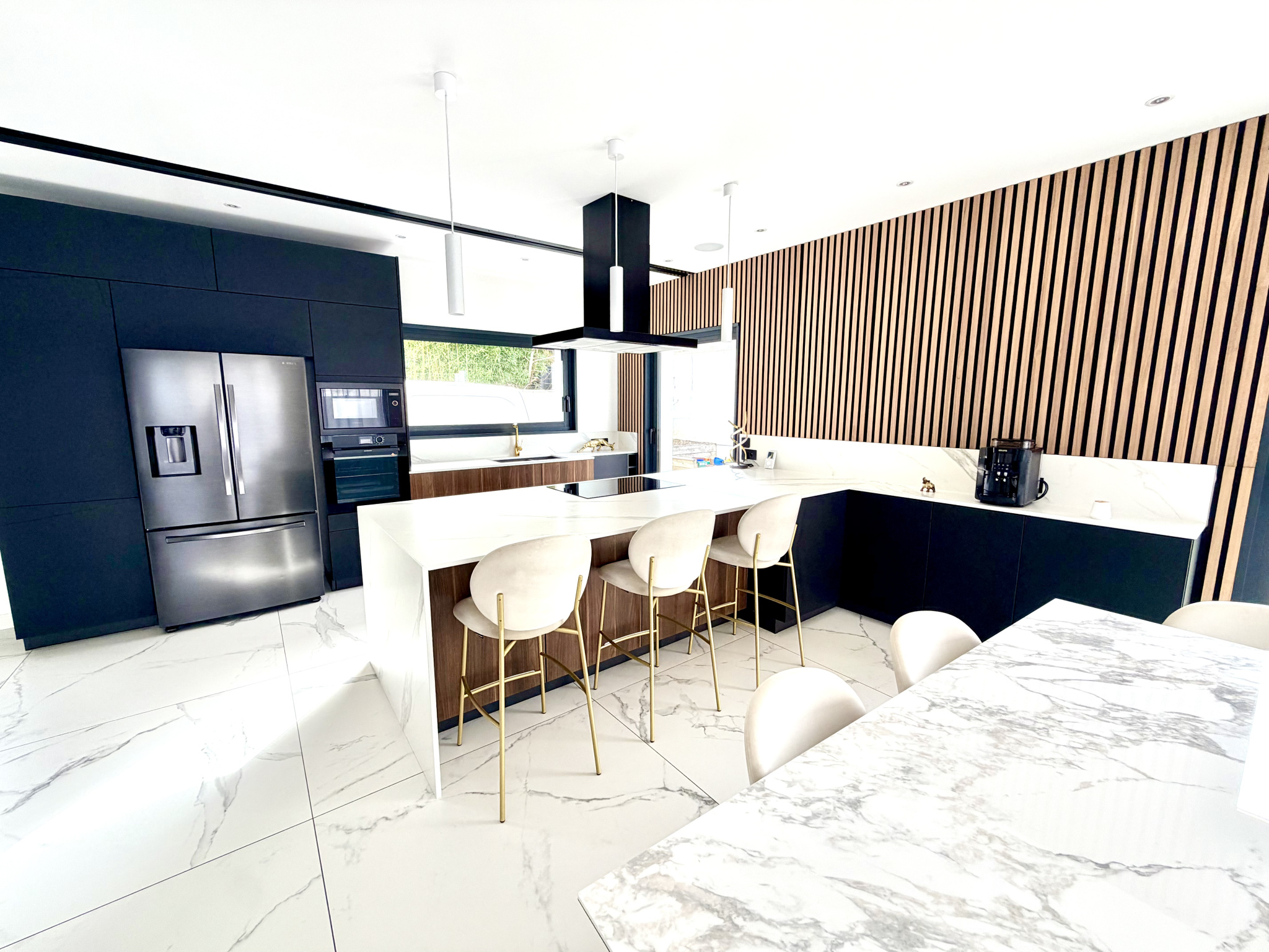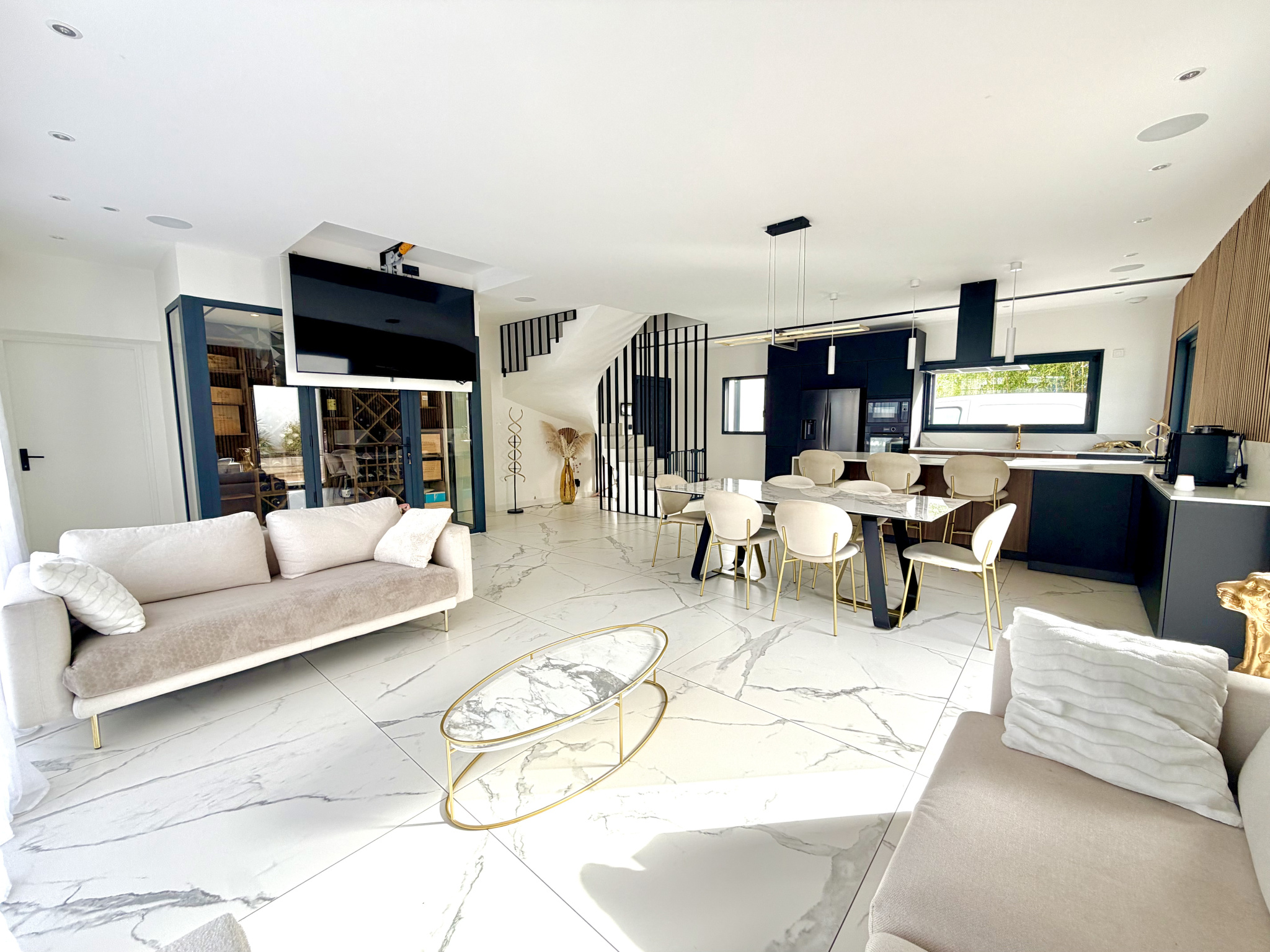 Dès l’entrée, les volumes séduisent : une pièce de vie de plus de 60 m², baignée de lumière, avec une cuisine sur-mesure Schmidt aux finitions irréprochables.