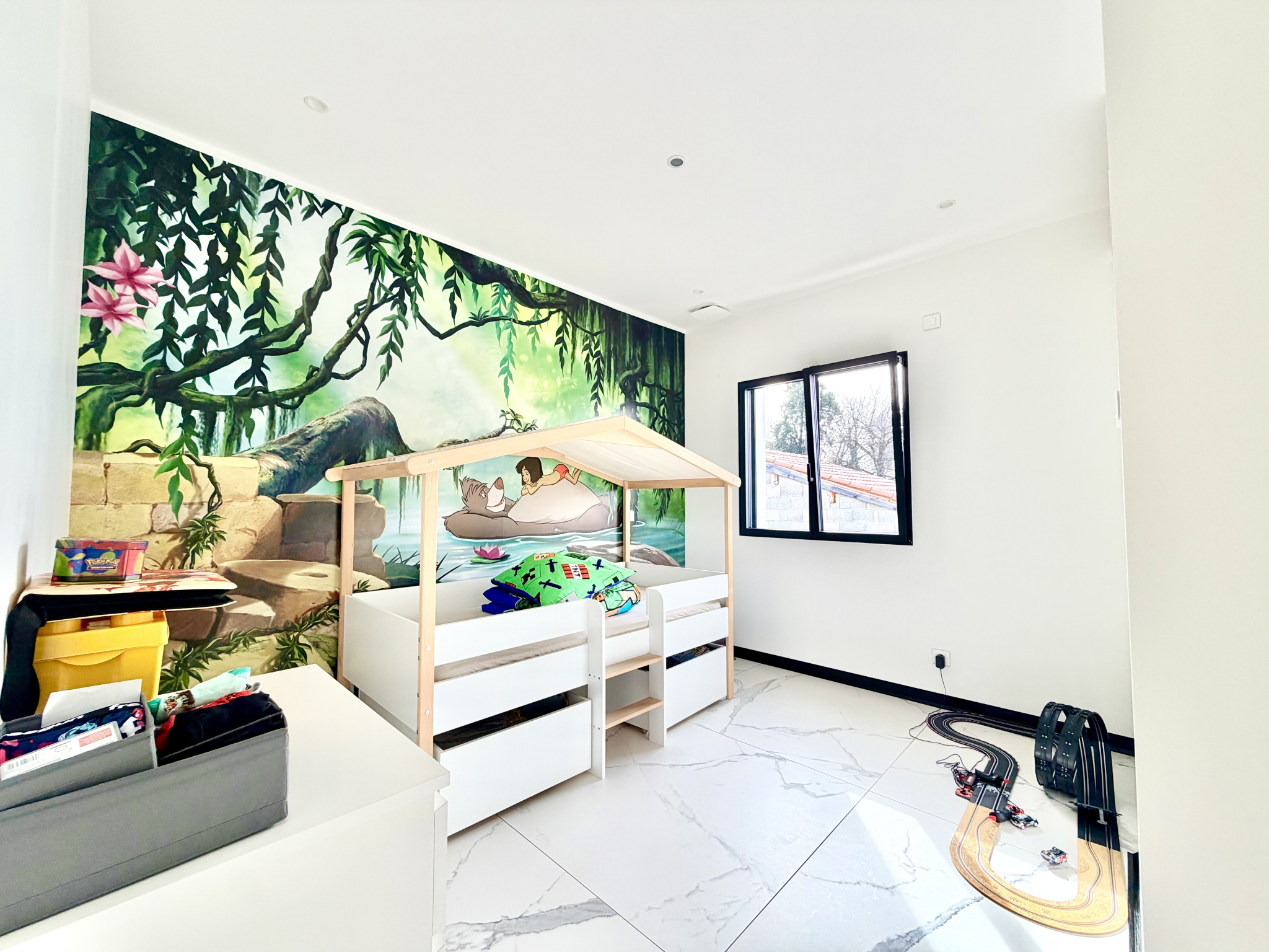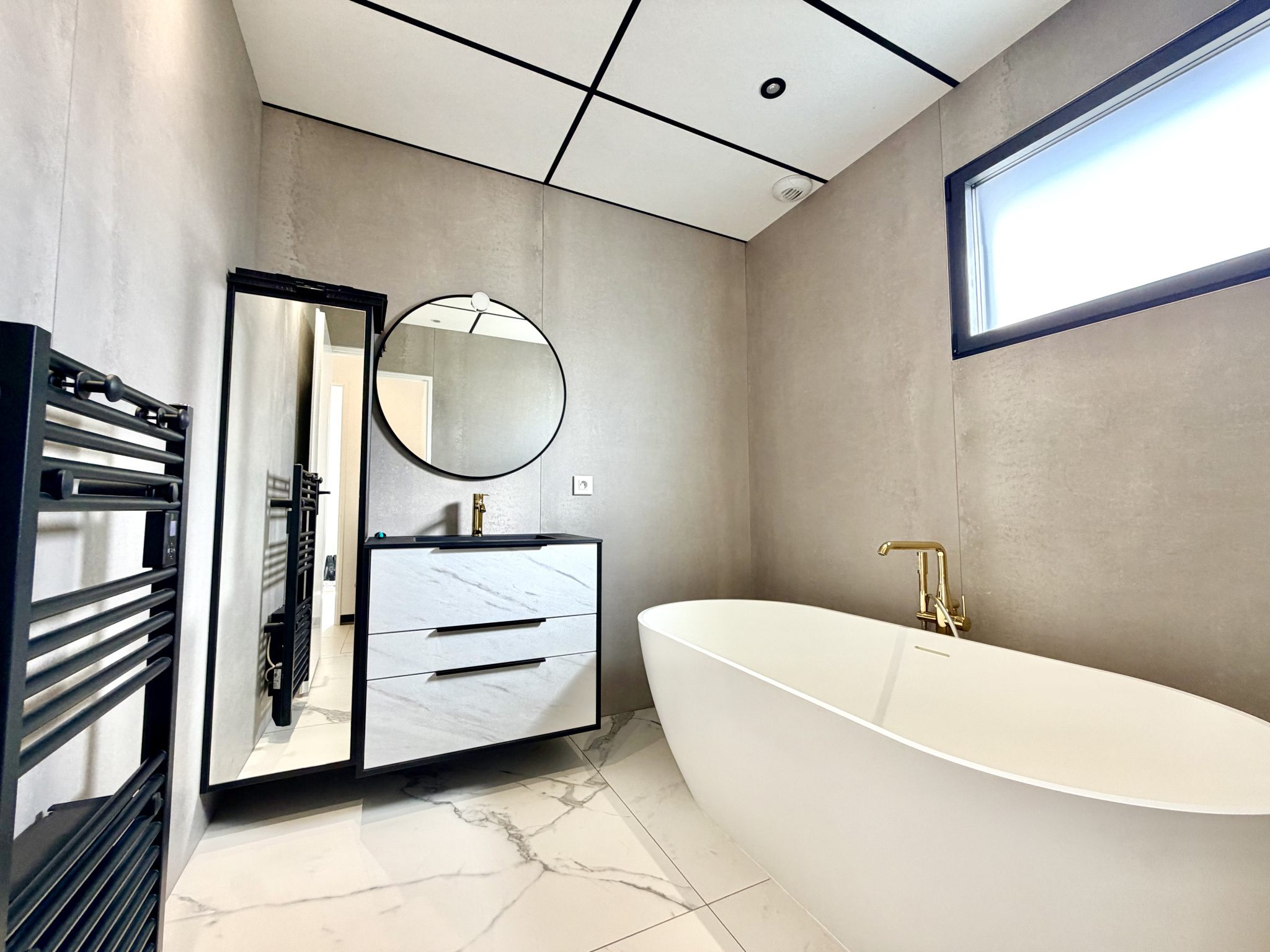À l’étage, trois chambres et une salle de bain élégante équipée de matériaux premium.