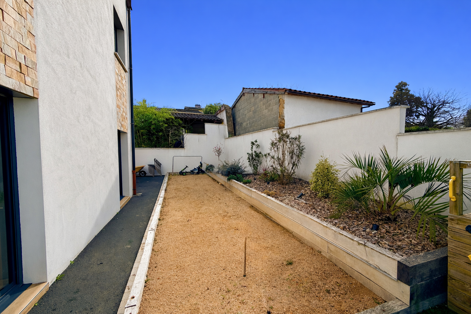 Implantée sur un terrain de 440 m², la maison bénéficie d’un aménagement extérieur complet :