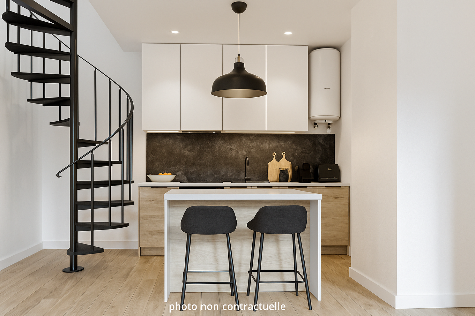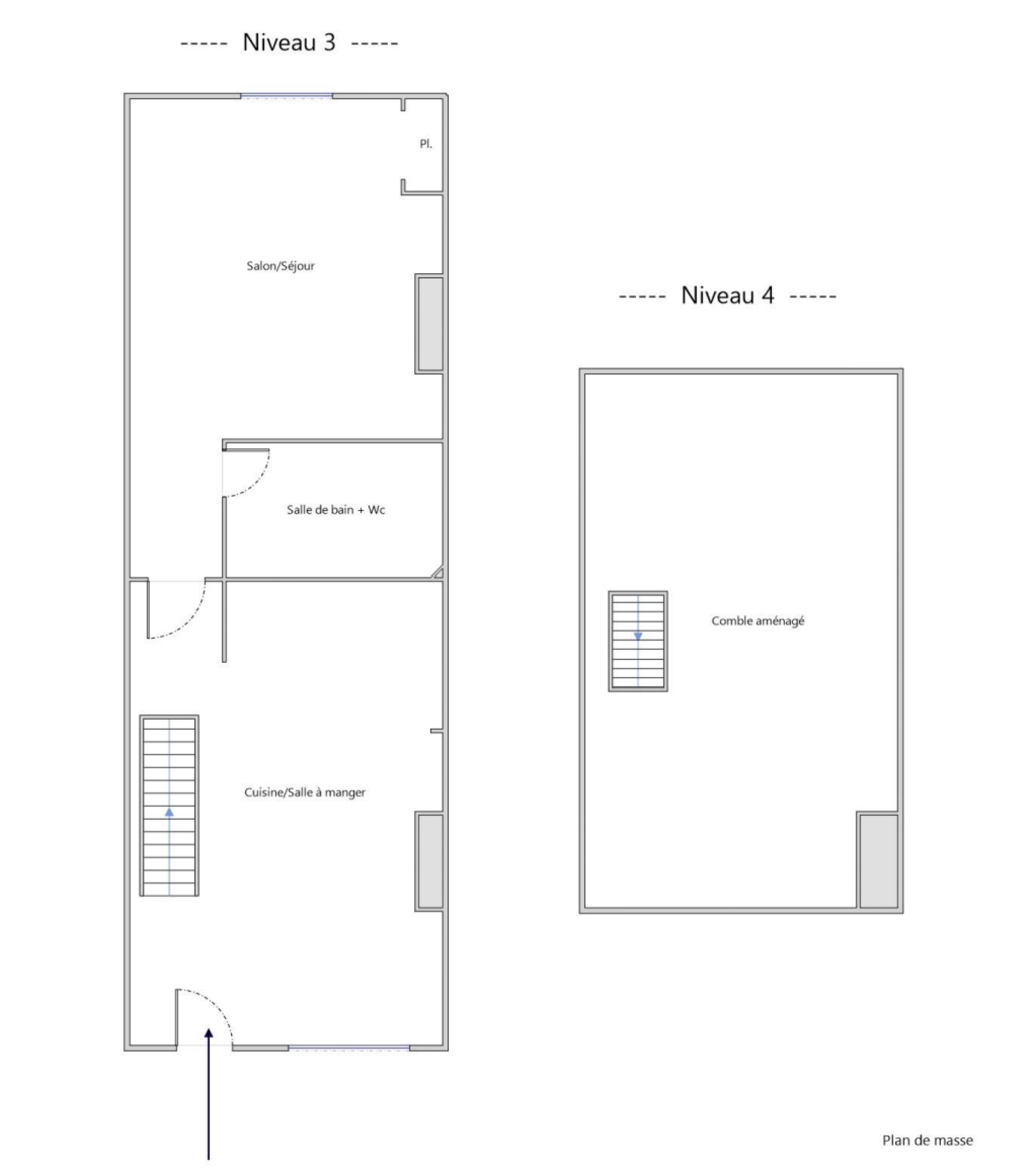 Il se compose d’un séjour avec cuisine, d’une salle de bains avec WC, et à l’étage, d’une chambre mansardée sous les toits, offrant un cachet unique.
