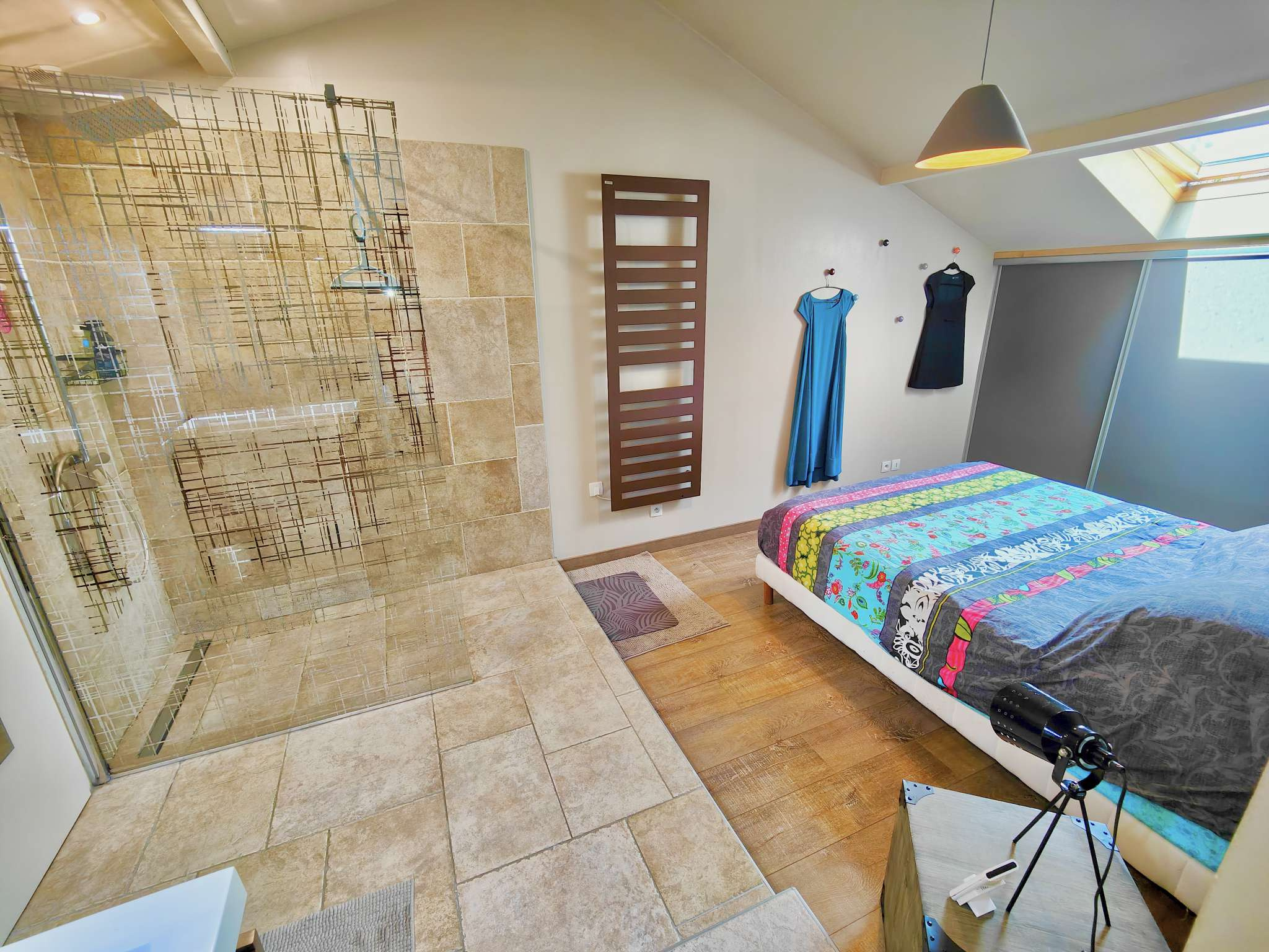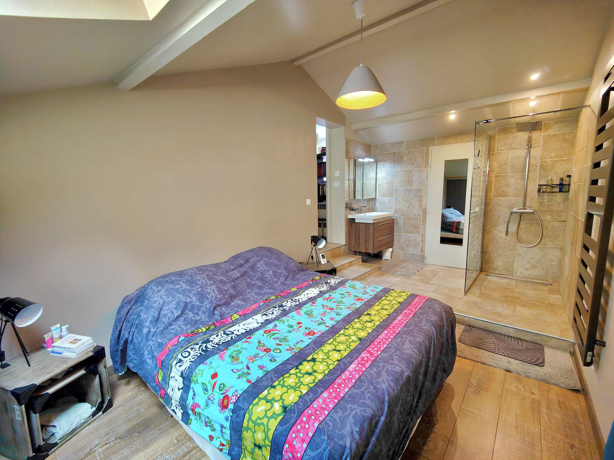 À l’étage, l’espace nuit se compose de trois chambres avec rangements, dont une suite parentale avec salle d’eau à l’italienne. Une salle de bains, une mezzanine(bureau, 5 eme chambre ou salle de jeu) et un second WC indépendant assurent une distribution confortable et équilibrée.